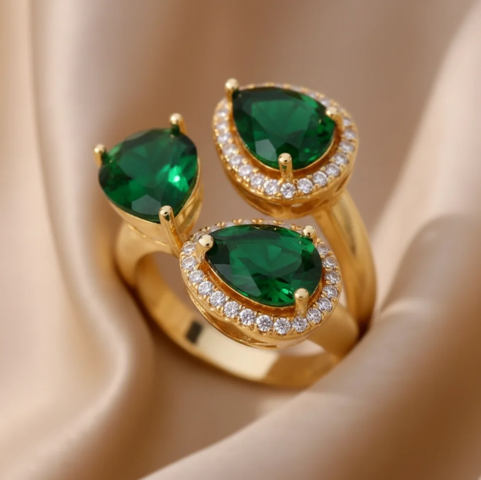 - Anillo Esmeria dorado con triple piedra verde de inspiración esmeralda y detalles de circonitas que aportan brillo y sofisticación.