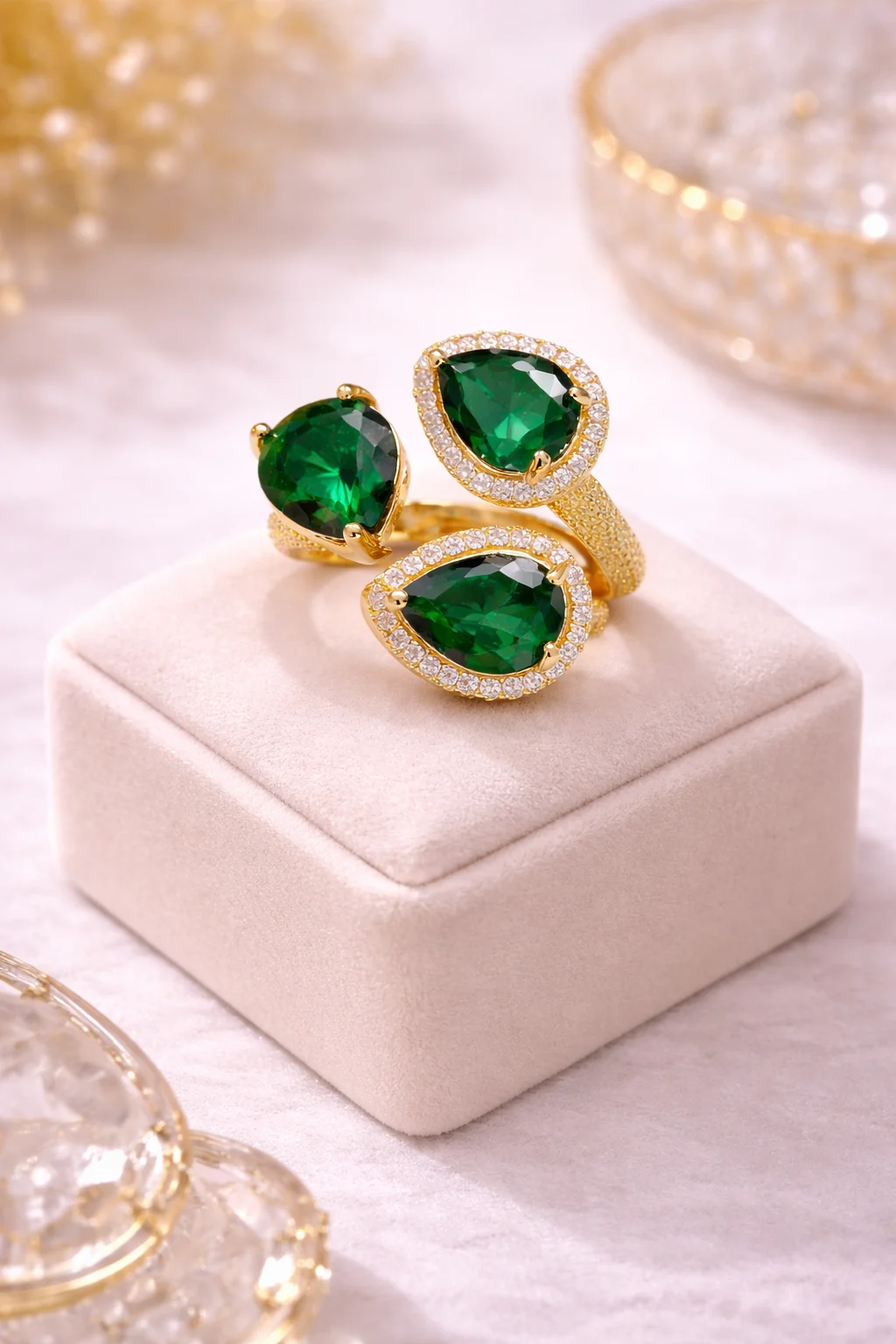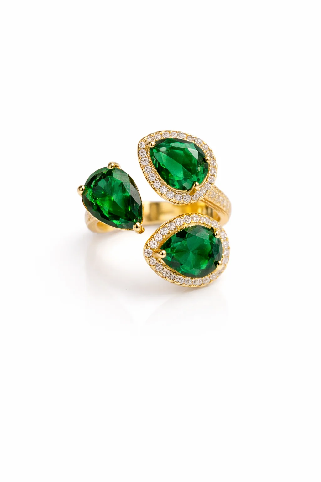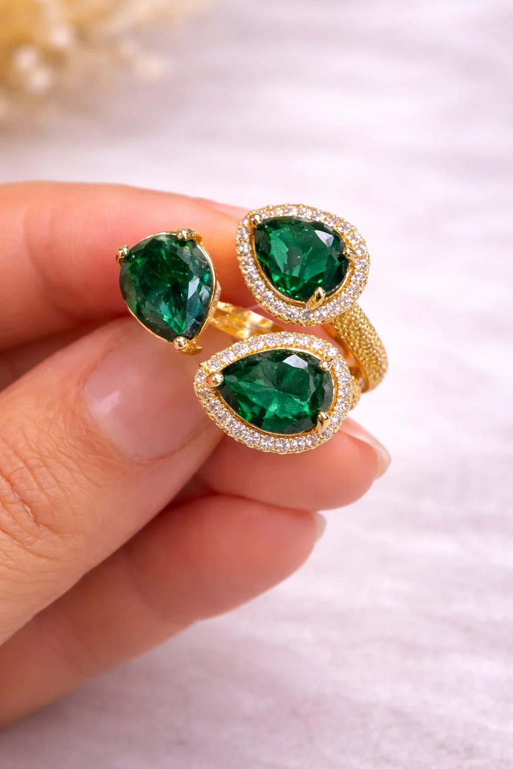 El Anillo Esmeria es una pieza que captura la esencia de la elegancia contemporánea con un toque de color intenso. Su diseño envolvente combina tres piedras verdes tipo esmeralda en forma de lágrima, rodeadas de delicados destellos que realzan su brillo y profundidad.
