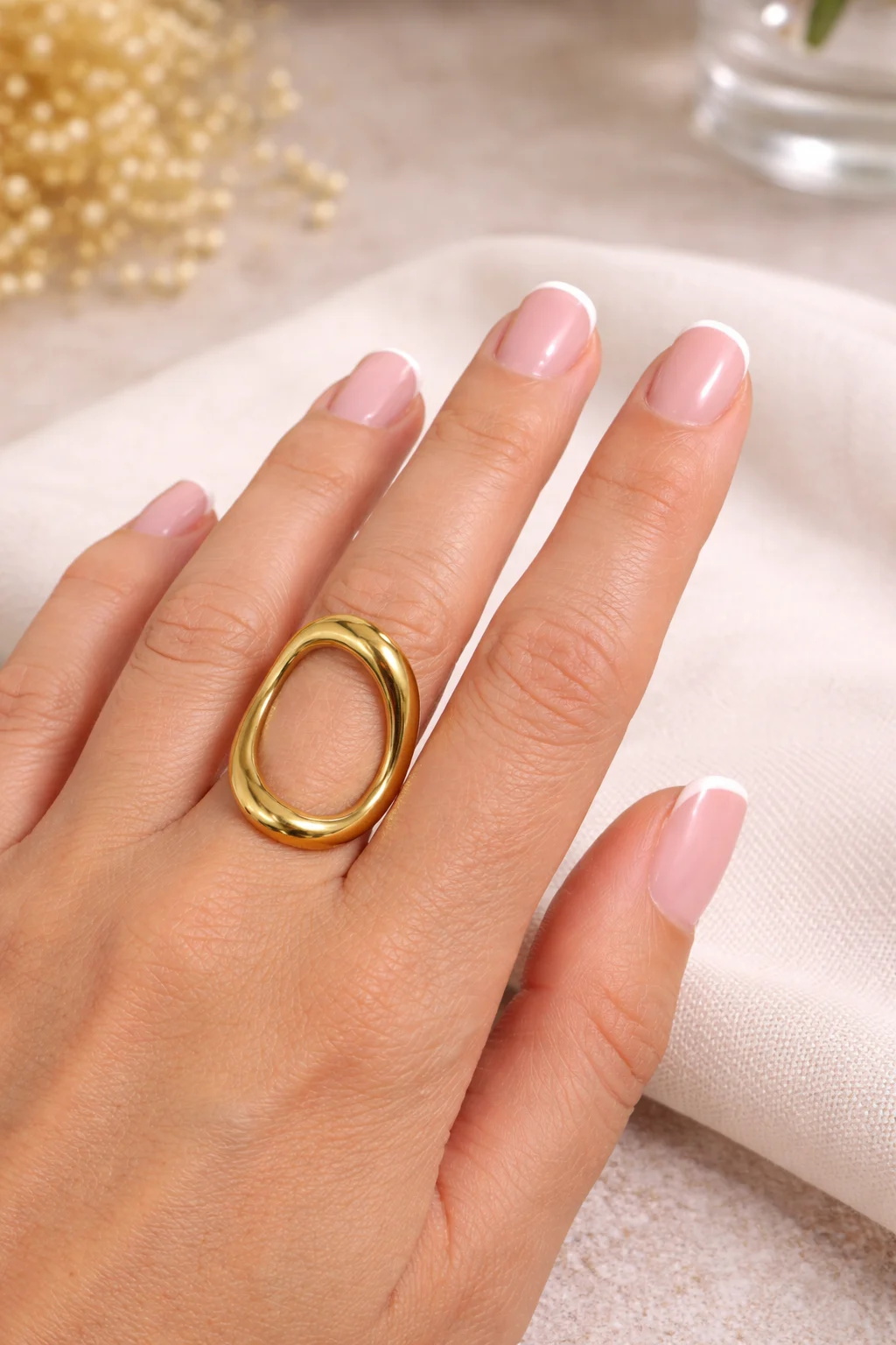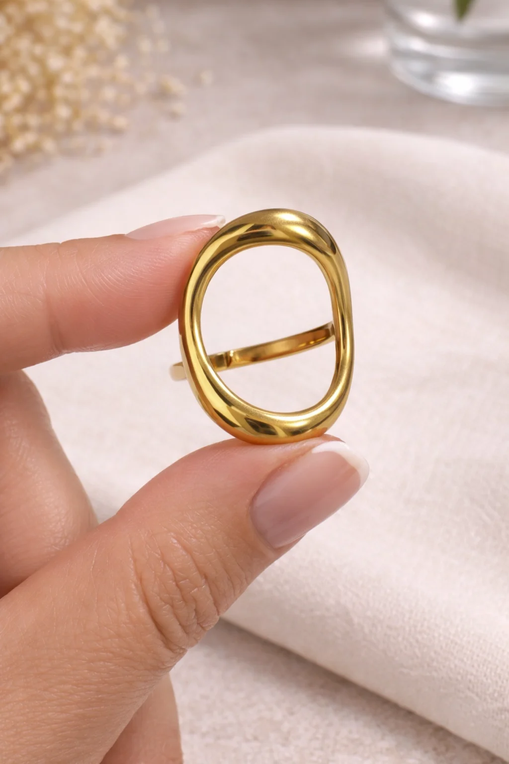- Anillo lienzo ajustable de forma orgánica y acabado pulido.