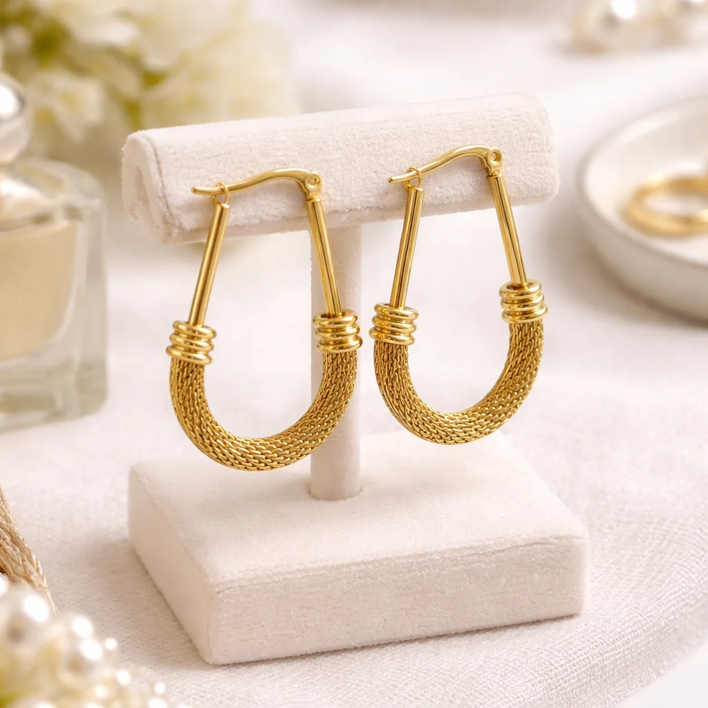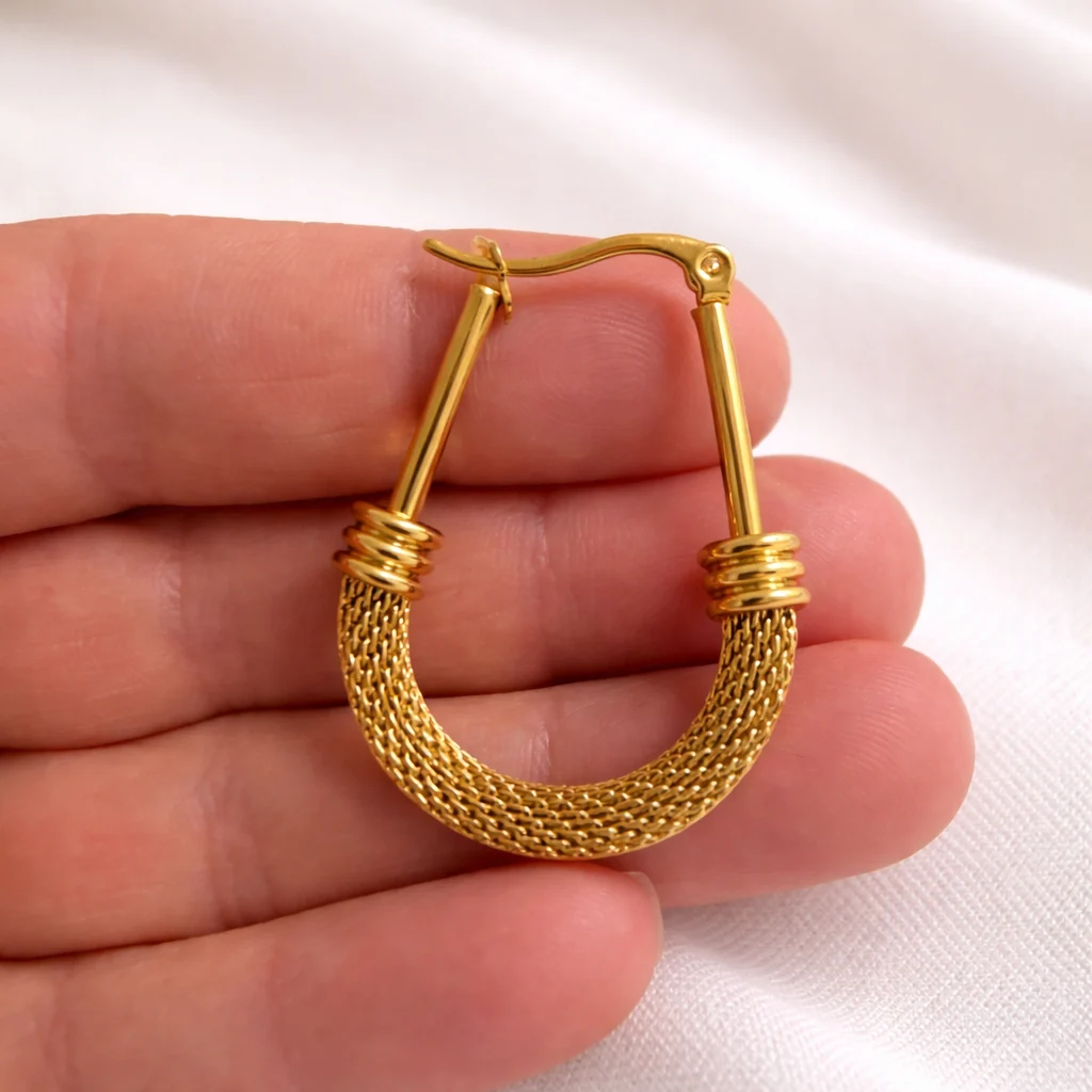 Aros dorados con diseño texturizado y acabado elegante. Una pieza versátil que eleva cualquier look con un toque moderno y sofisticado.