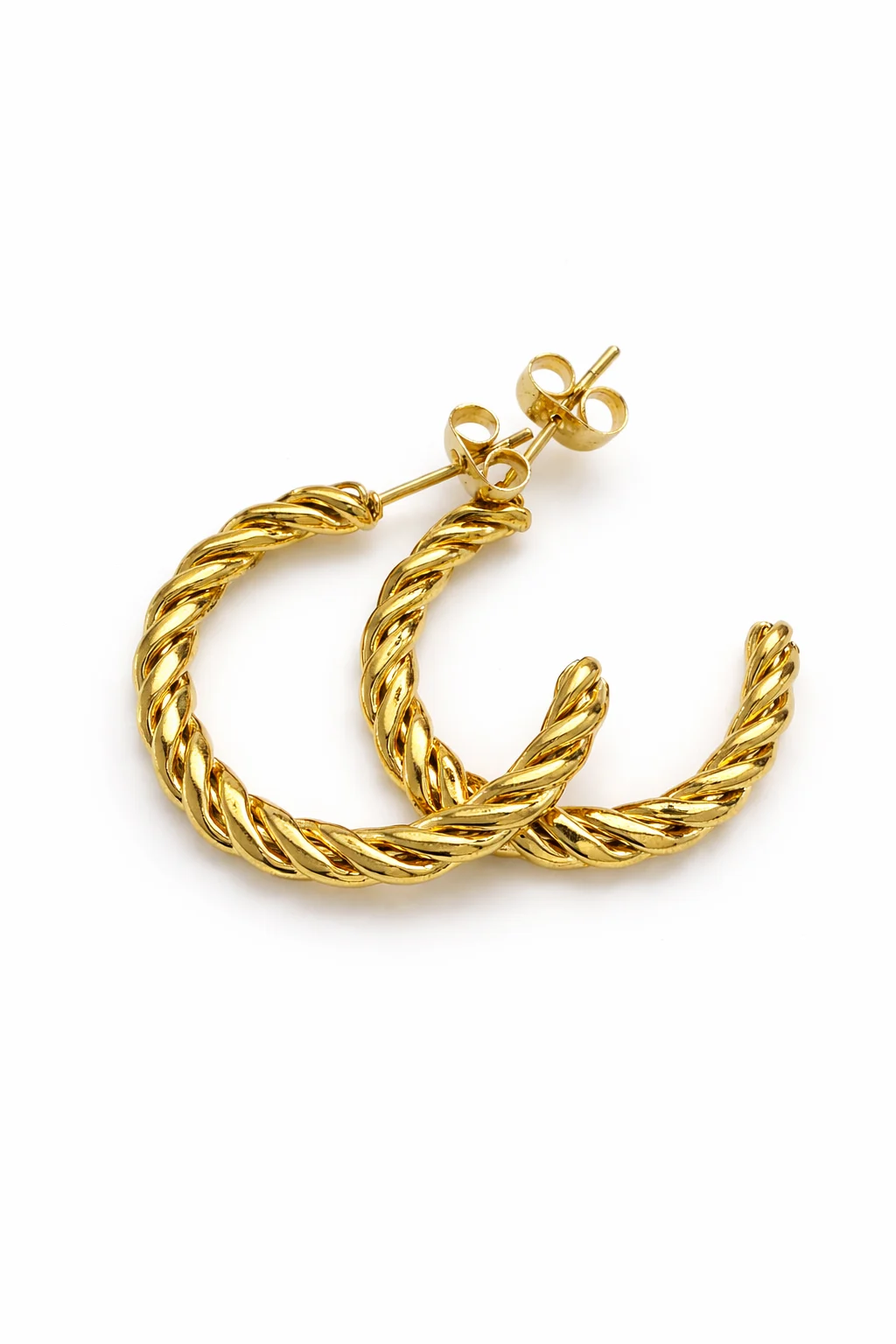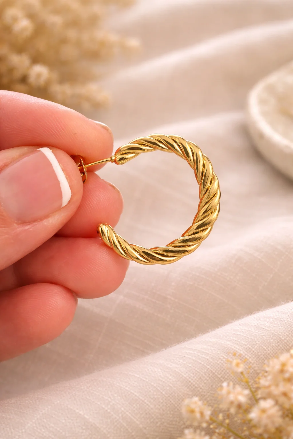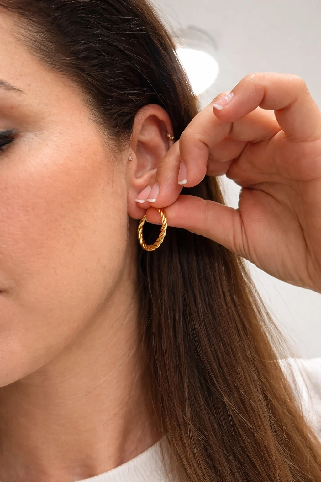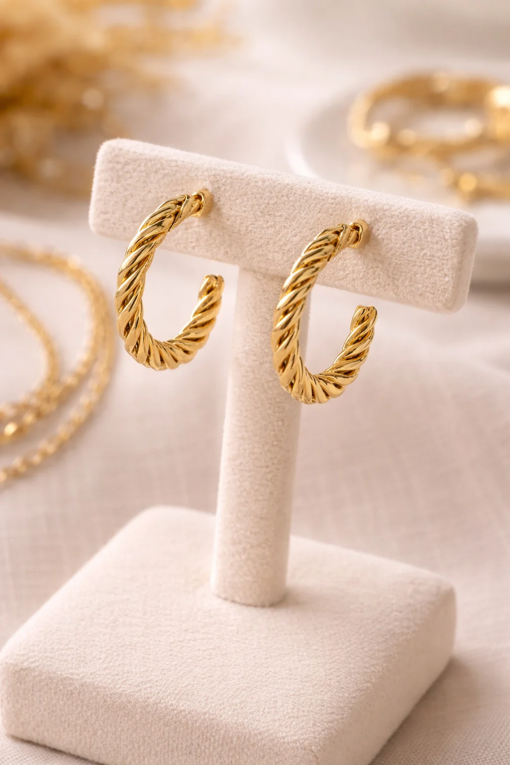 Aros dorados con diseño trenzado que aportan textura y elegancia. Un básico con personalidad para elevar cualquier look.