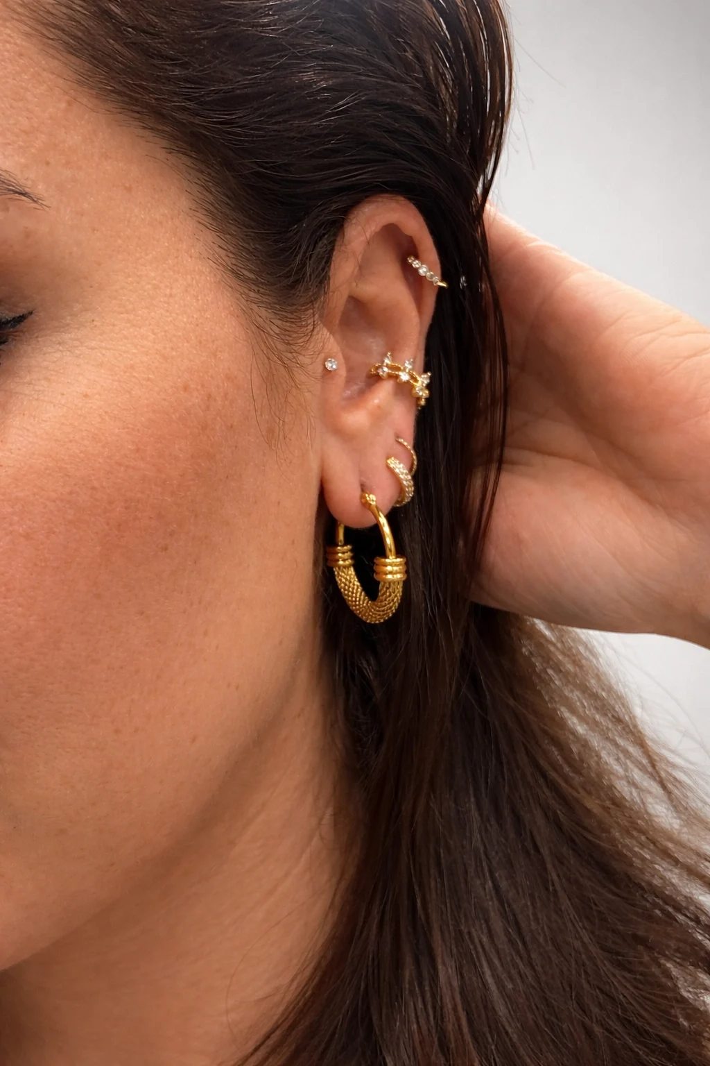 El acabado dorado aporta un brillo cálido y elegante que realza cada curva del diseño, reflejando la luz con delicadeza y aportando luminosidad al rostro. Gracias a su estructura fluida, estos pendientes alcanzan un equilibrio perfecto entre sofisticación y carácter.