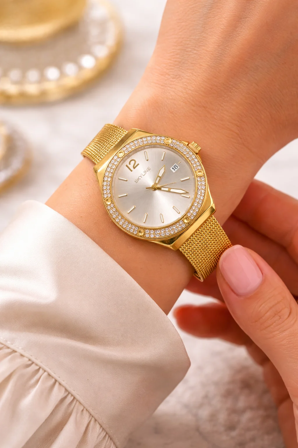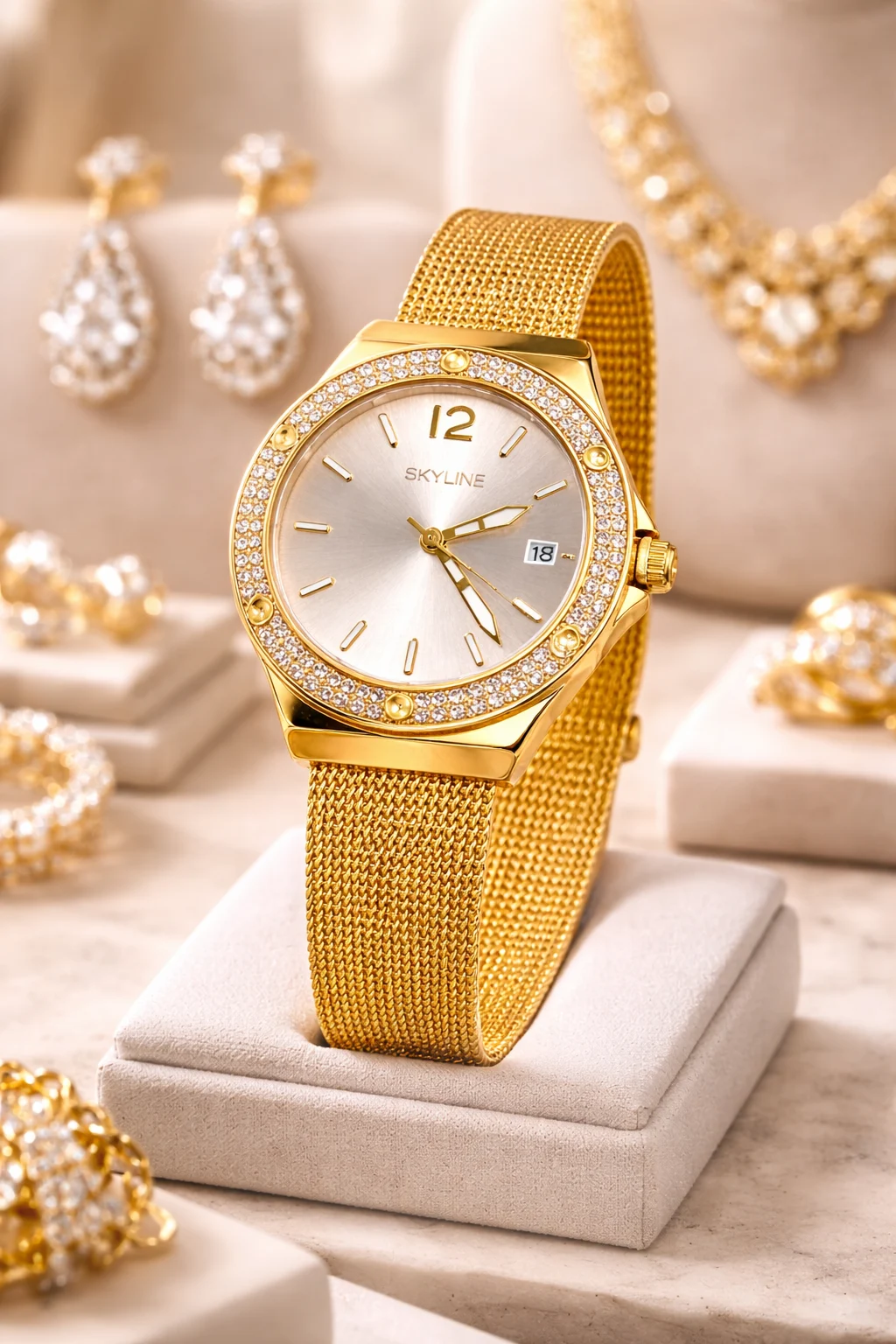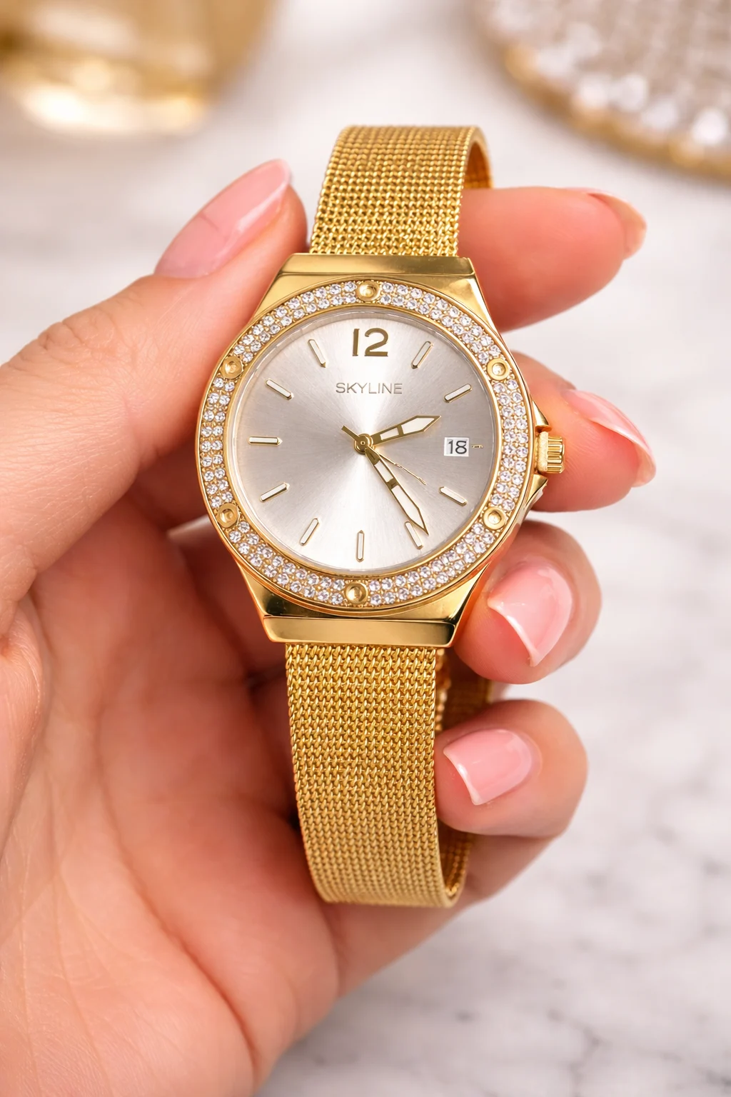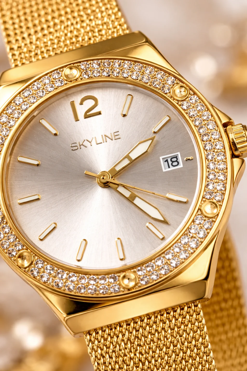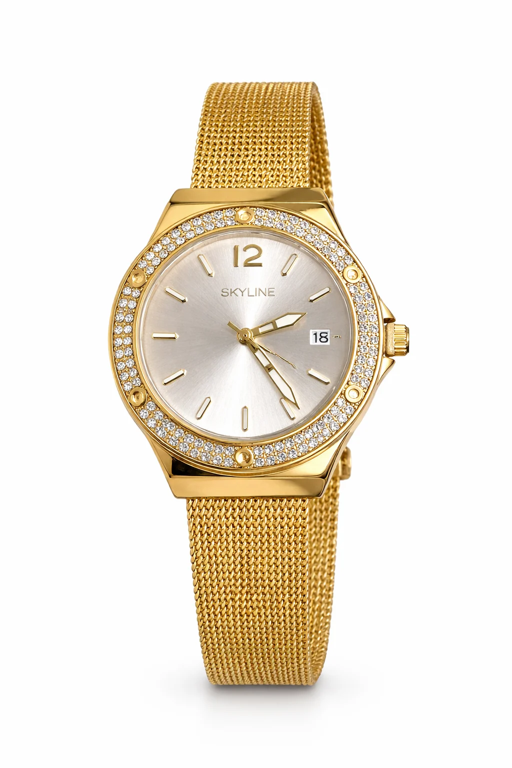 El Skyline Aura Gold es un reloj femenino elegante y luminoso. Su acabado dorado en acero inoxidable, el bisel decorado con circonitas y la correa de malla fina crean una pieza sofisticada que realza cualquier estilo.
