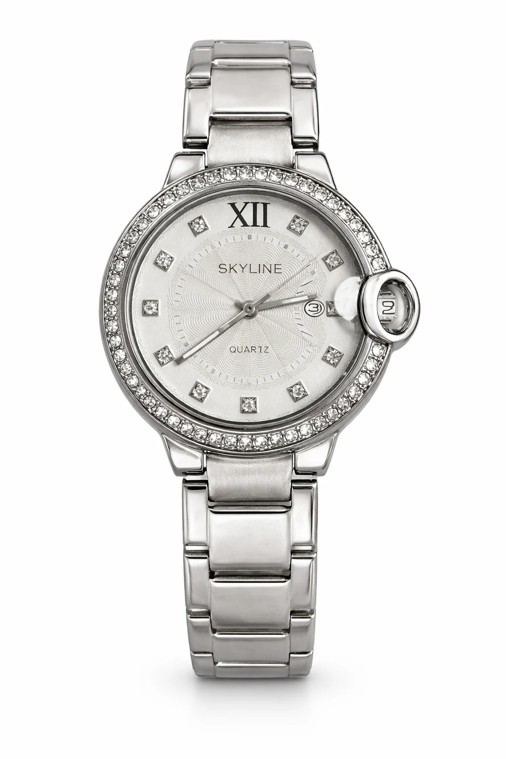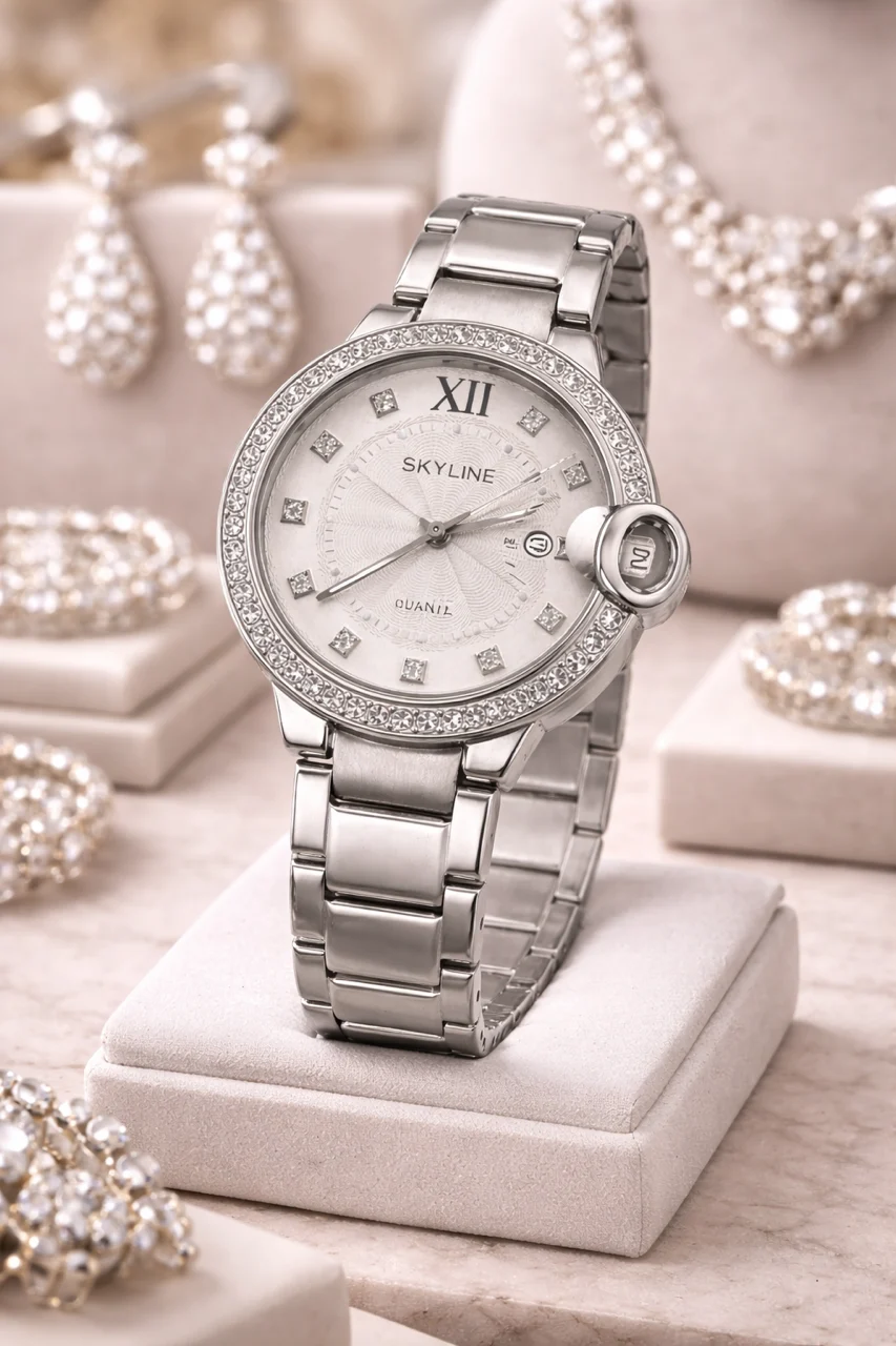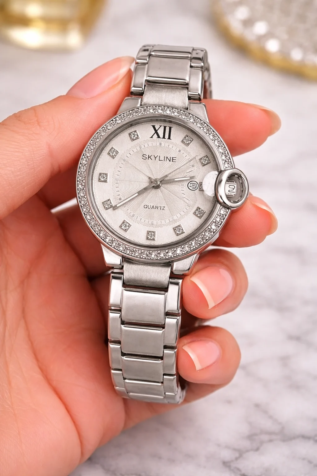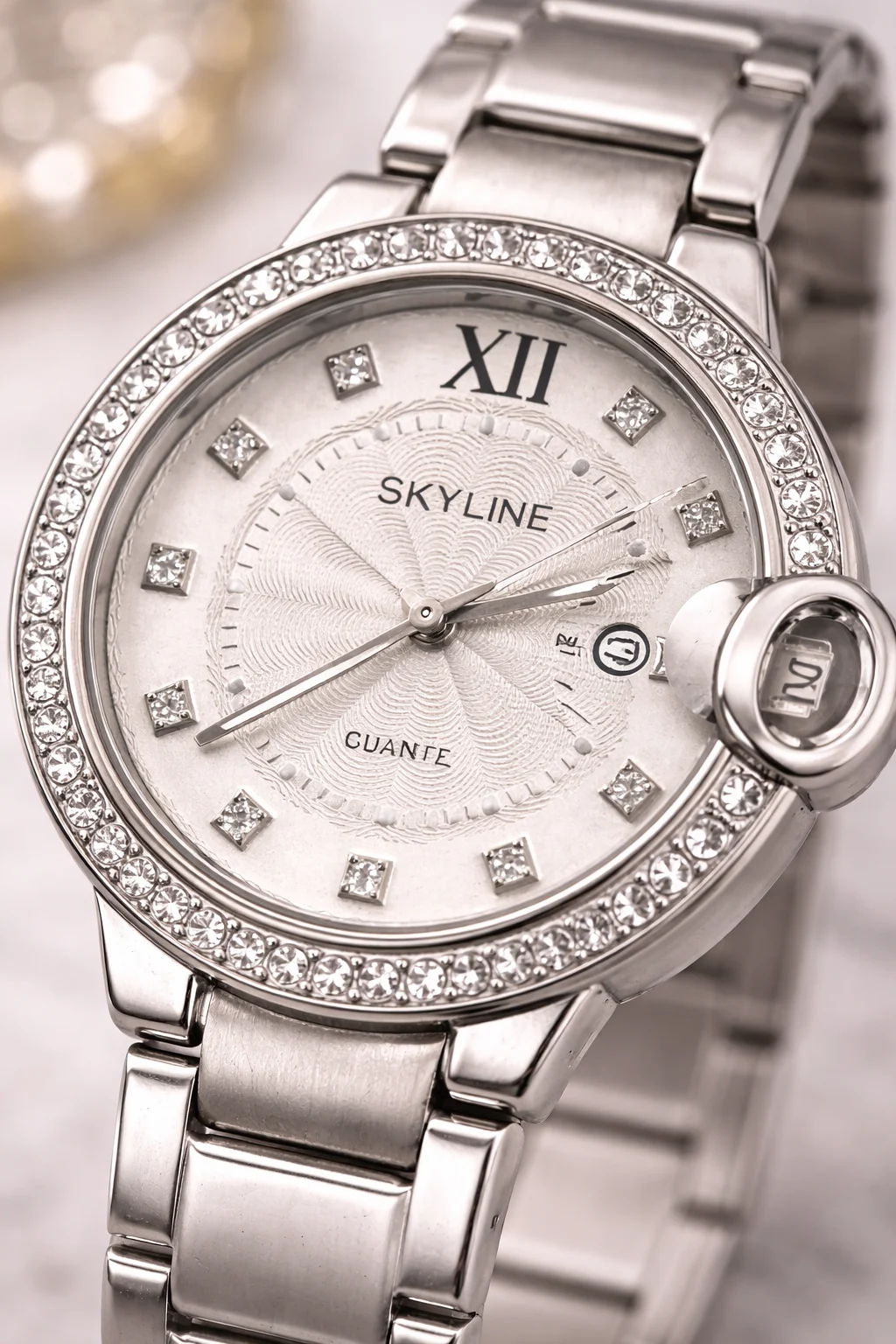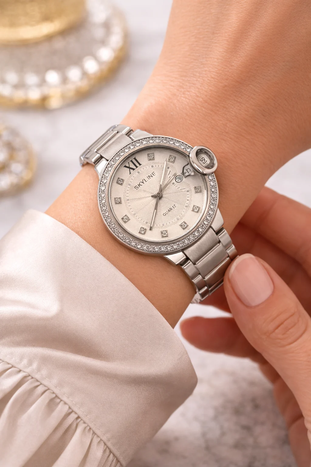El Skyline Éclat Steel es un reloj diseñado para mujeres que buscan una pieza elegante, luminosa y atemporal. Su esfera plateada con textura radial refleja la luz de forma delicada, creando un efecto sofisticado que resalta cada detalle del diseño.