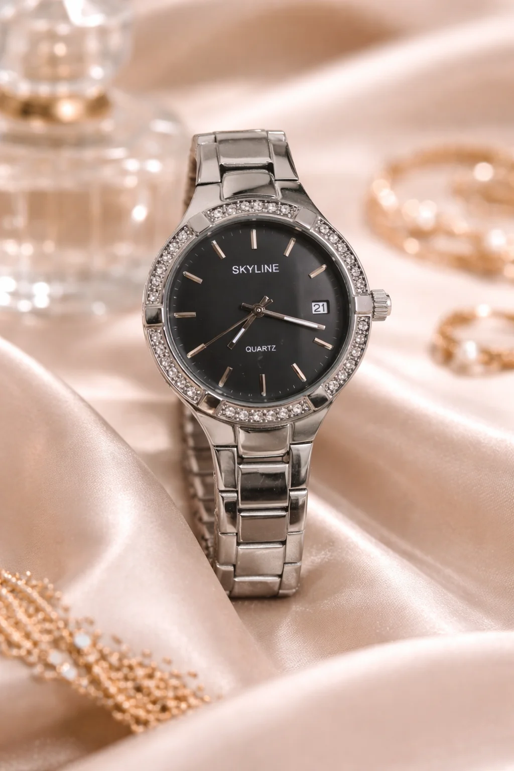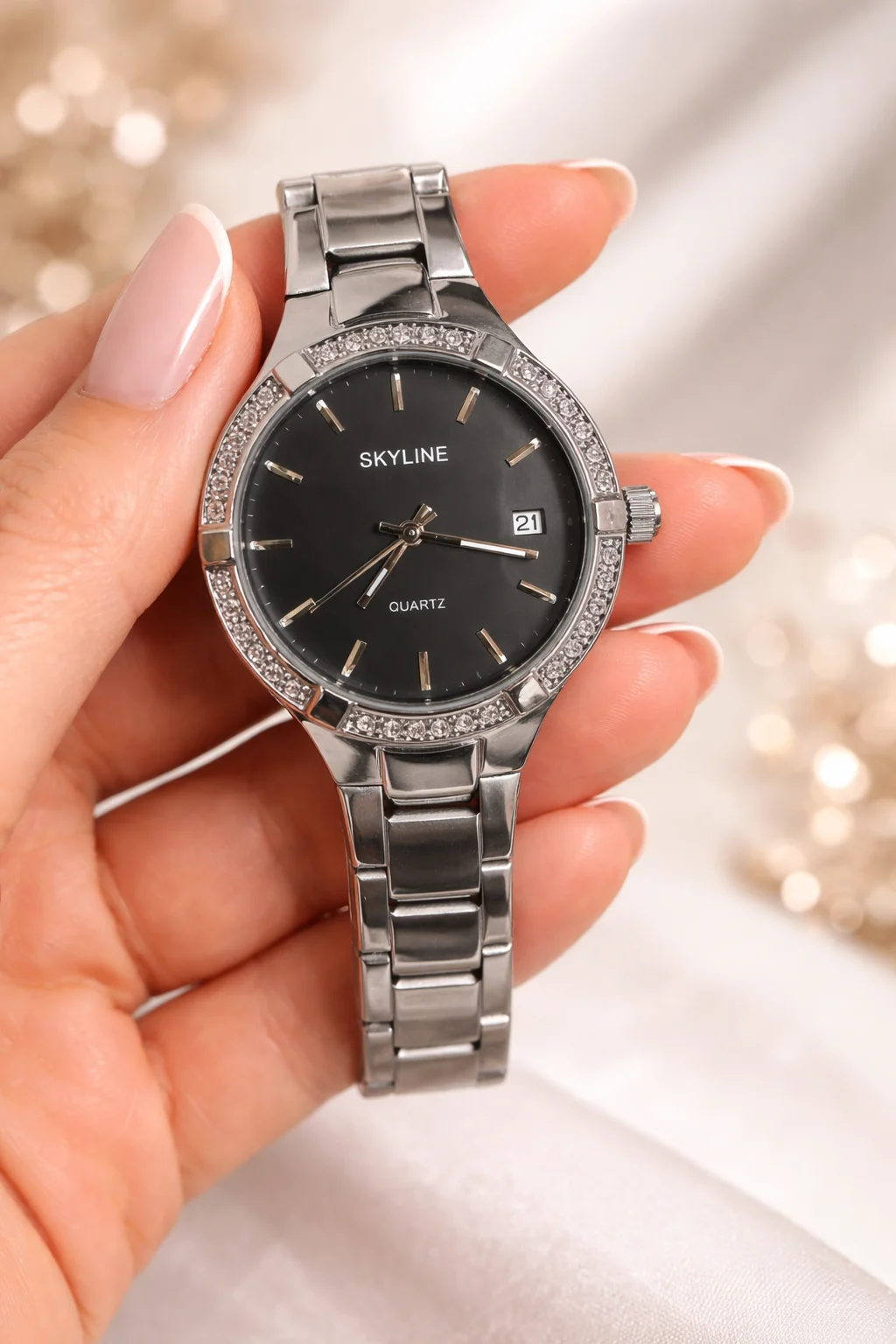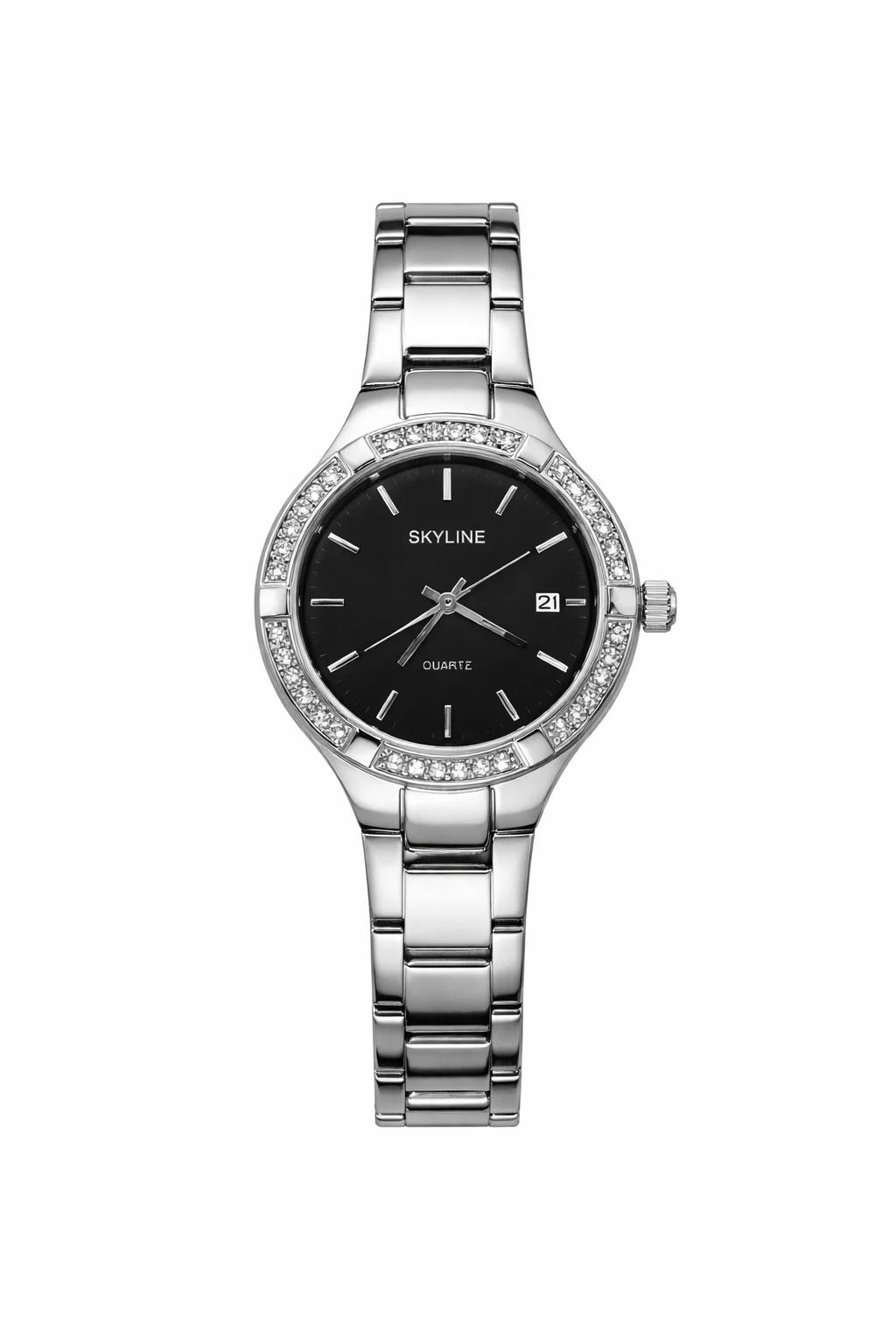 El reloj Skyline Éclipse Steel destaca por su diseño elegante y atemporal. Su esfera negra aporta un contraste sofisticado con el brillo del bisel decorado con circonitas, creando una pieza refinada que eleva cualquier look.