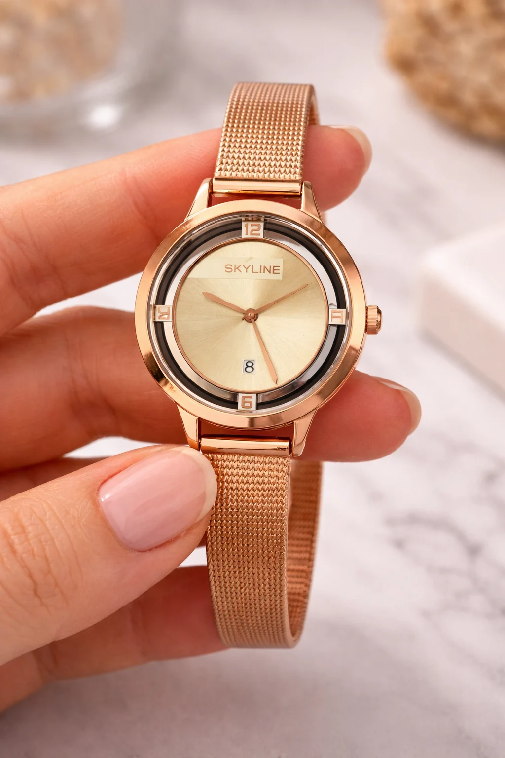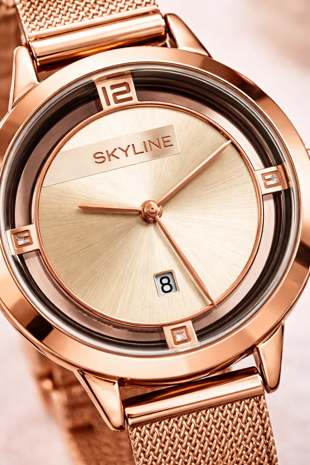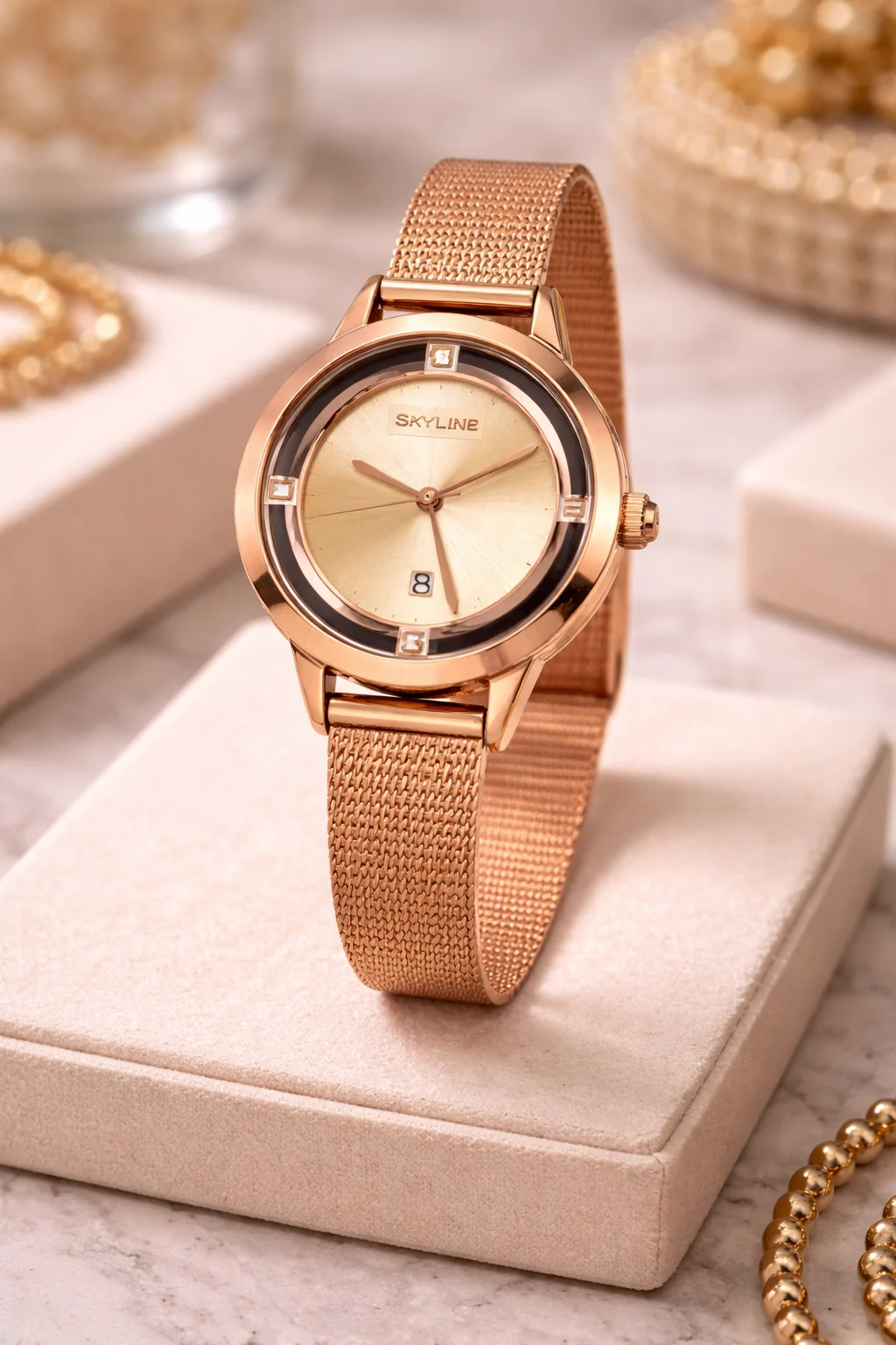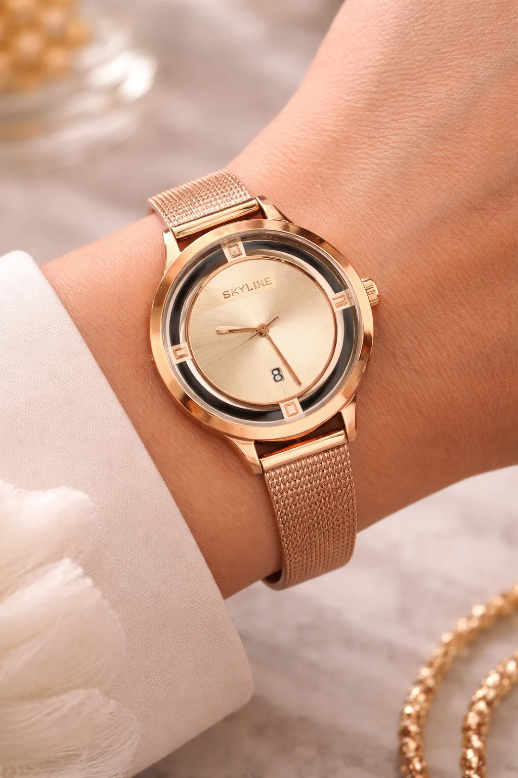 El Skyline Rosé Élégance es una pieza que transmite suavidad, elegancia y feminidad en cada detalle. Su diseño minimalista se realza con un acabado rosé cálido que aporta luz y sofisticación.